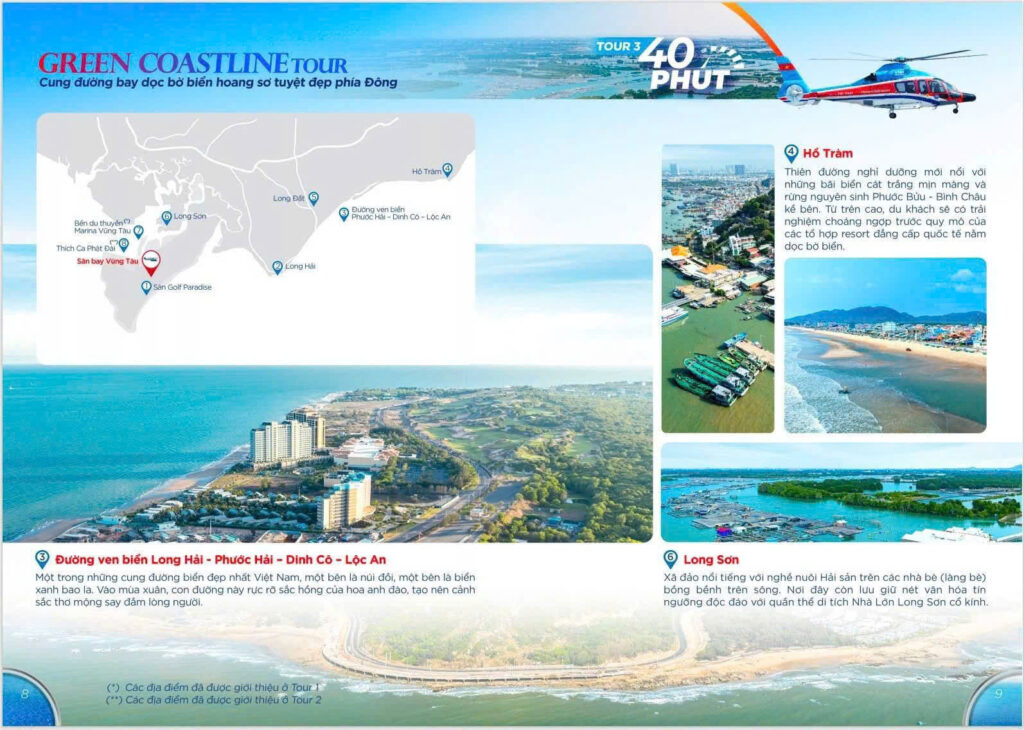 Từ khoang trực thăng hiện đại, du khách sẽ được chiêm ngưỡng toàn cảnh thành phố biển Vũng Tàu và hành trình bay dọc theo bờ biển hướng về Long Hải và Hồ Tràm. Những địa danh nổi bật hiện ra sống động dưới chân bạn như: